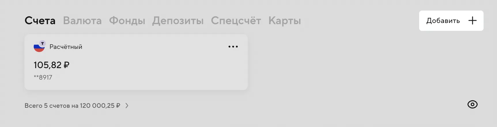 На главной странице интернет-банка или приложения нажмите «Добавить +» напротив раздела «Счета и карты».