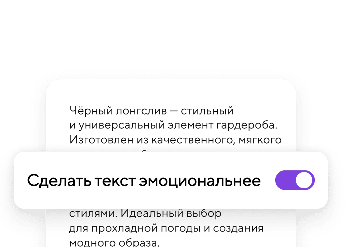 Искусственный интеллект составит за вас SEO-описание товаров для Wildberries, Ozon, Яндекс Маркета и Мегамаркета. Это поможет улучшить позиции товара в результатах поиска, а значит больше потенциальных покупателей обратит на него внимание.